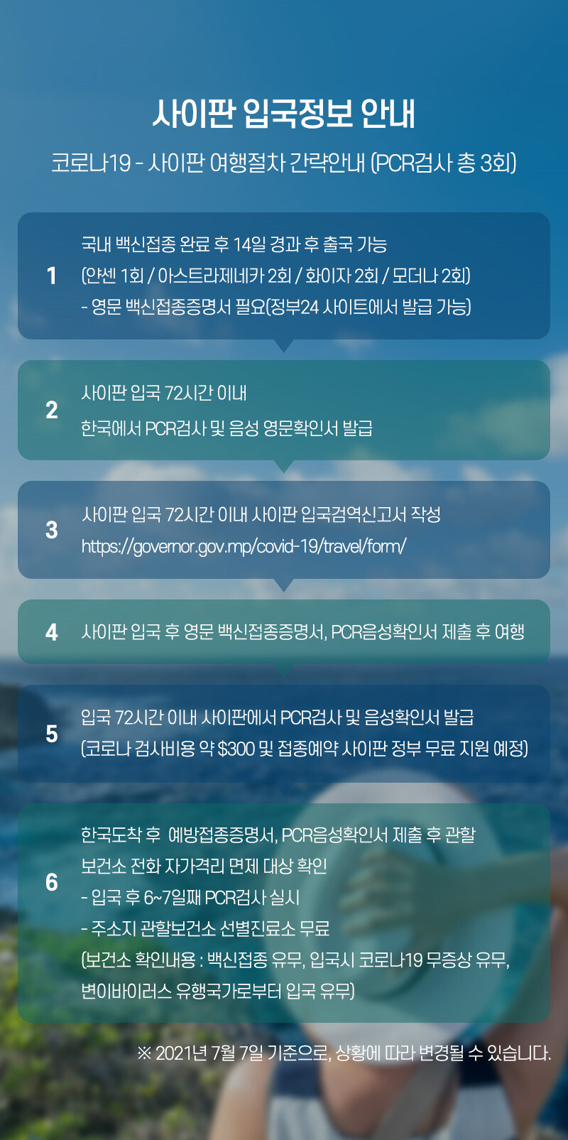 ★★ 둘 !! 사이판 도착후 필수 1. 도착 익일부터 5일차 현지 PCR 검사 진행(한국 귀국 72시간이내) 비용 1인 $300 무료 ★★★ 셋 !!! 한국도착 후 PCR 검사 진행 순서 1. 국내 예방접종 완료 해외입국자 자가격리 면제 가능안내 입국시 예방접종증명서 및 |