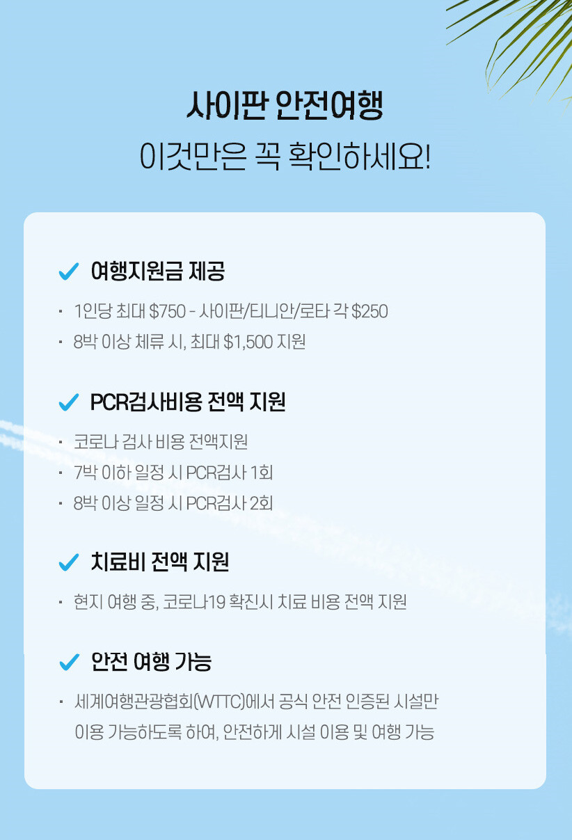 * 현지 PCR검사 진행 (출국 72시간 이내) -사이판 정부 차량으로 이동 -카노아리조트에서 PCR테스트 진행예정 -자세한 시간 및 안내사항은 현지에서 제공됩니다.